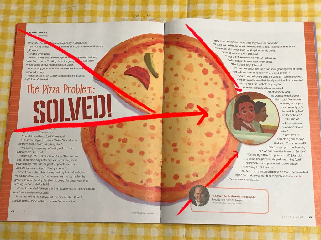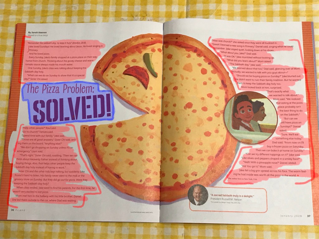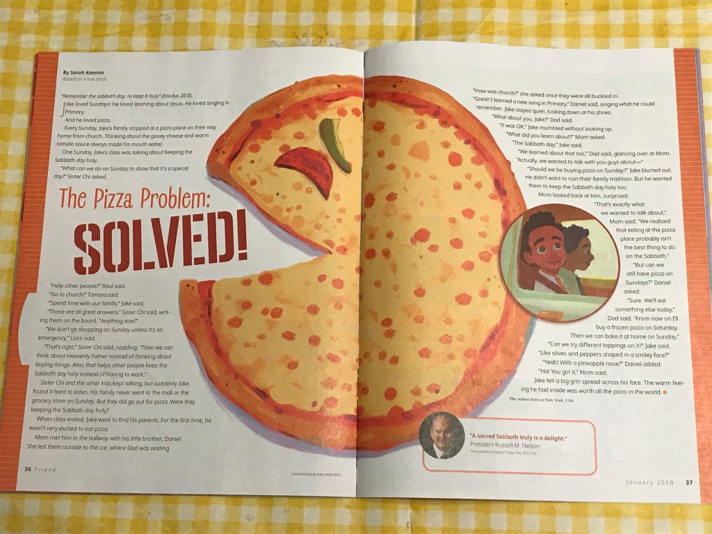 The issue is January 2020, that can be found on LDS.org, the article is written by Sarah Keenan. The page is found and published by The Church of Jesus Christ of Latter Day Saints, and is made to uplift and teach individuals the Gospel of Jesus Christ. The magazine that this is in is aimed towards children and in this particular article it talks about a nice lesson relating to pizza, with a giant pie found in the middle of the page!